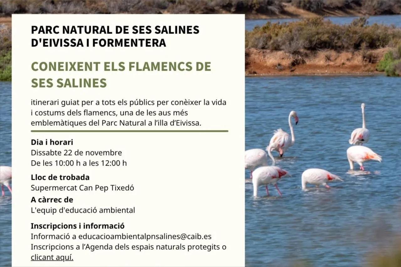 Las Reservas Naturales de Ibiza organizan una visita guiada para conocer de cerca a los flamencos que cada año regresan a los estanques de Las Salinas con sus crías. Durante el recorrido, el equipo de educación ambiental explicará su alimentación, migración y las curiosidades que convierten a esta especie en símbolo del humedal ibicenco.