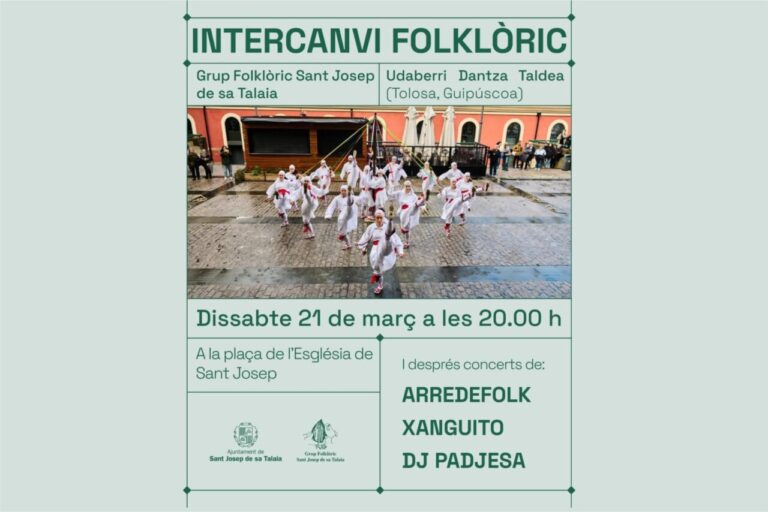 El Grup Folklòric de Sant Josep de sa Talaia organiza una jornada festiva dentro de las celebraciones locales con una ballada tradicional que contará con la participación especial de Udaberri Dantza Taldea, grupo procedente de Guipúzcoa que mostrará sus bailes tradicionales vascos.