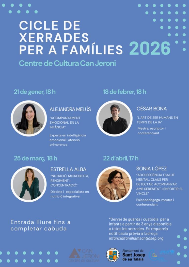 El Ayuntamiento de Sant Josep de sa Talaia impulsa por segundo año consecutivo el Ciclo de Xerrades per a Famílies, una iniciativa gratuita dirigida a madres, padres y referentes educativos, centrada en el acompañamiento emocional, la educación y la salud de infancia y adolescencia.