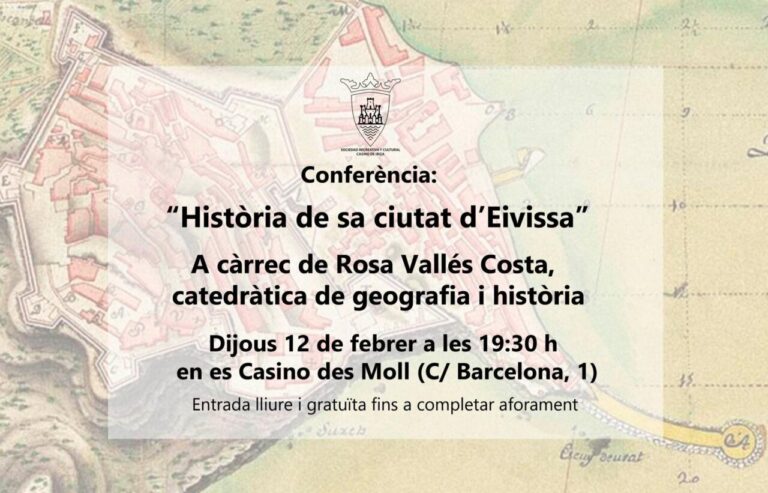 La Sociedad Recreativa y Cultural Casino de Ibiza organiza la conferencia ‘Història de sa ciutat d’Eivissa’, a cargo de la catedrática de Geografía e Historia Rosa Vallés Costa.