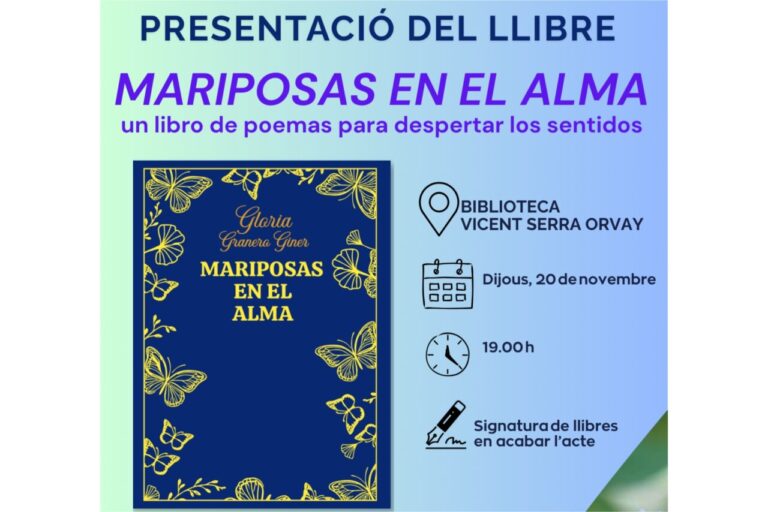 La Biblioteca de Sant Jordi acoge la presentación de Mariposas en el Alma, el primer poemario de Gloria Granero, una obra que reúne más de treinta años de creación y explora el amor, la naturaleza y la espiritualidad. La autora, con vínculos personales y creativos con Ibiza, compartirá algunos de sus poemas en un acto que contará también con la participación del escritor Óscar Figueruelo. Tras la lectura, habrá un breve espacio de diálogo con el público.