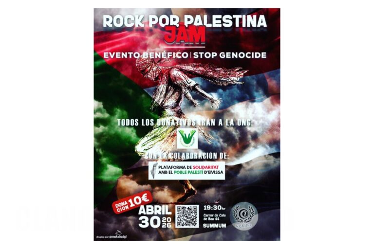El próximo 30 de abril, Ibiza acoge “Rock Jam por Palestina”, un evento musical solidario que reunirá a cerca de 50 músicos de la isla en una potente jam session de rock, punk y metal con el objetivo de recaudar fondos para el pueblo palestino.