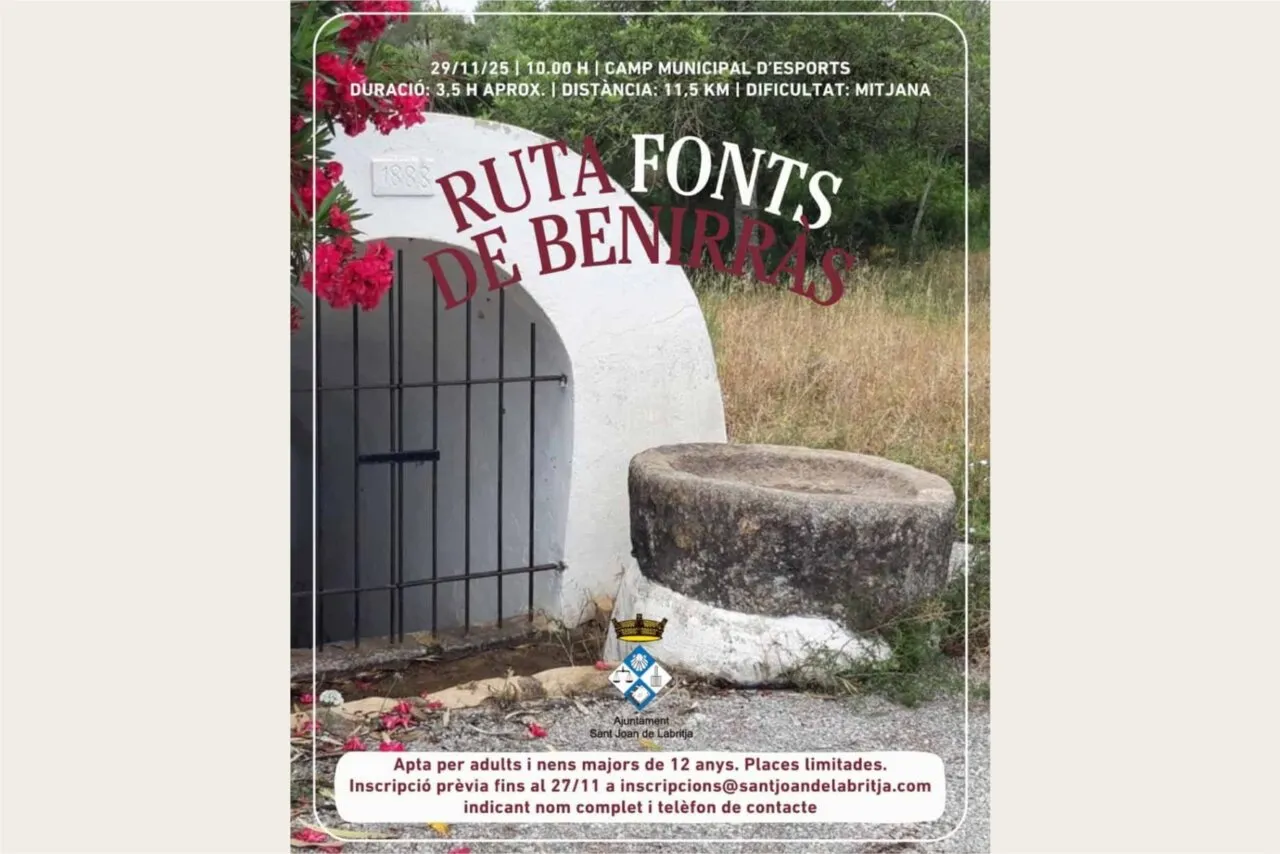 Sant Joan organiza la Ruta Fuentes de Benirràs, una excursión gratuita ideal para descubrir la Ibiza más auténtica a través de sus senderos, fuentes tradicionales y rincones rurales menos transitados. El recorrido, de 11,5 km y dificultad media, dura aproximadamente 3 horas y media y está guiado por expertos locales.