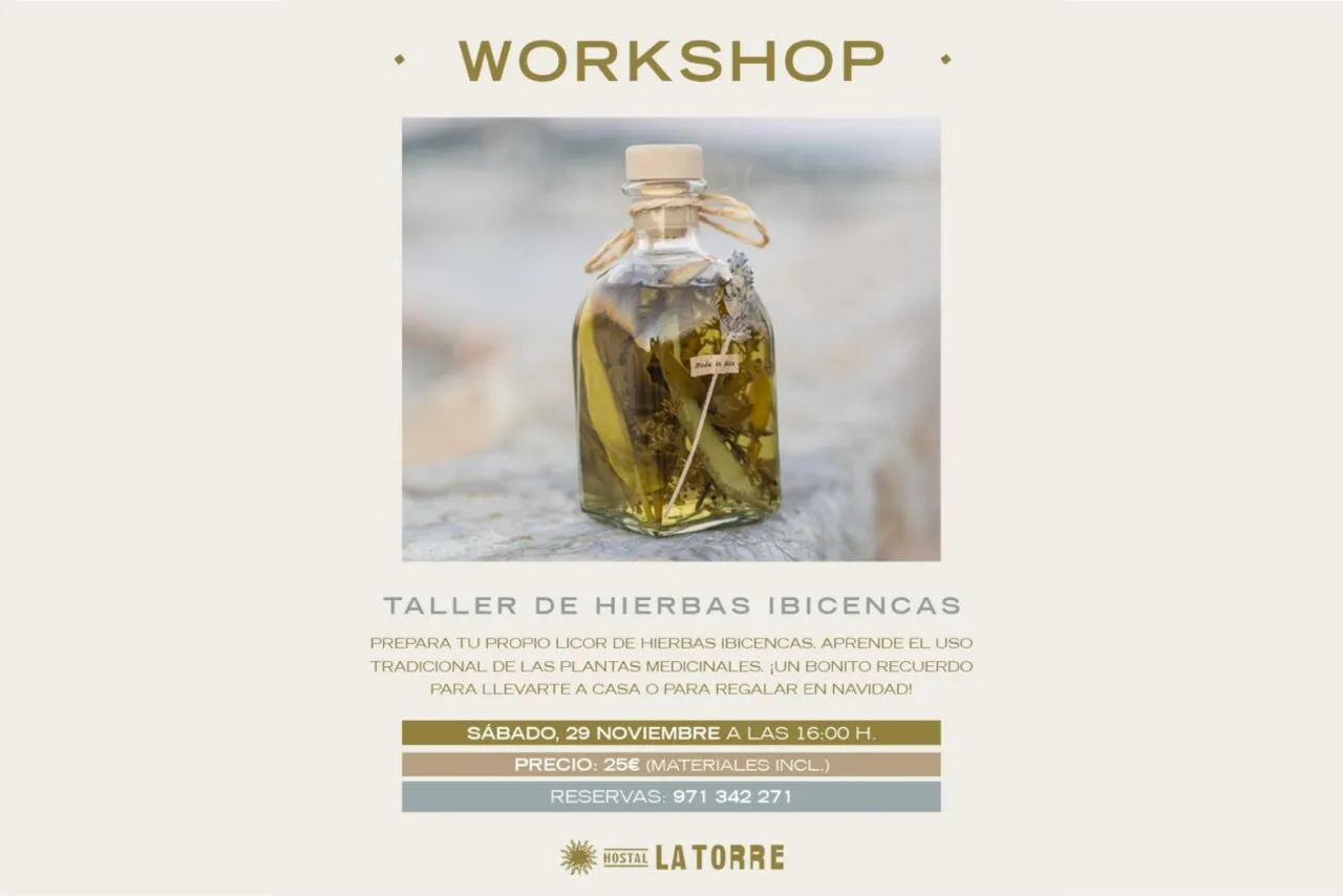 El emblemático Hostal La Torre organiza un taller práctico para aprender a elaborar las auténticas hierbas ibicencas, el licor tradicional de la isla preparado con plantas autóctonas como romero, tomillo o hinojo. Durante la actividad descubrirás el proceso de elaboración y podrás llevarte tu propia botella hecha por ti.