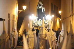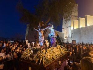 Cofradías recorren las empinadas calles del casco histórico en un ambiente de recogimiento pese a las dificultades del recorrido. La jornada se extiende también a Santa Eulària con una procesión acompañada por música en directo.