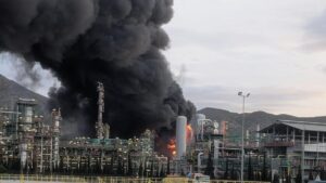 El fuego, localizado en una unidad de destilación del Valle de Escombreras, ha generado una densa columna negra. Emergencias recomienda sellar puertas y ventanas en Alumbres, Escombreras y La Unión.