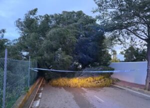 La Policía Local mantiene acordonada la zona del polígono Eurocentro mientras avanzan los trabajos de retirada de restos del techo arrancado por el viento y se contabilizan más de medio centenar de incidencias por caída de árboles en la isla.