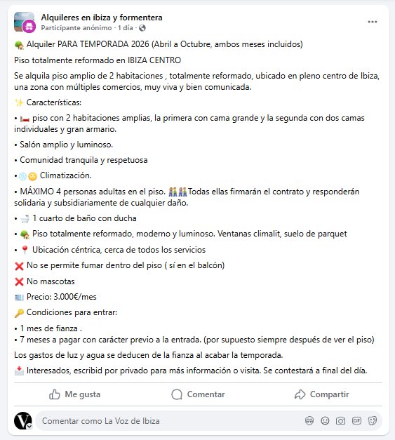 La locura de precios del mercado del alquiler en Ibiza sigue generando indignación por lo insólito de algunos anuncios que circulan en redes sociales y grupos especializados en la búsqueda de vivienda. El último ejemplo se ha difundido en un grupo de Facebook, donde se oferta un piso para la temporada turística de 2026 con condiciones económicas que han vuelto a encender el debate sobre el acceso a la vivienda en la isla.