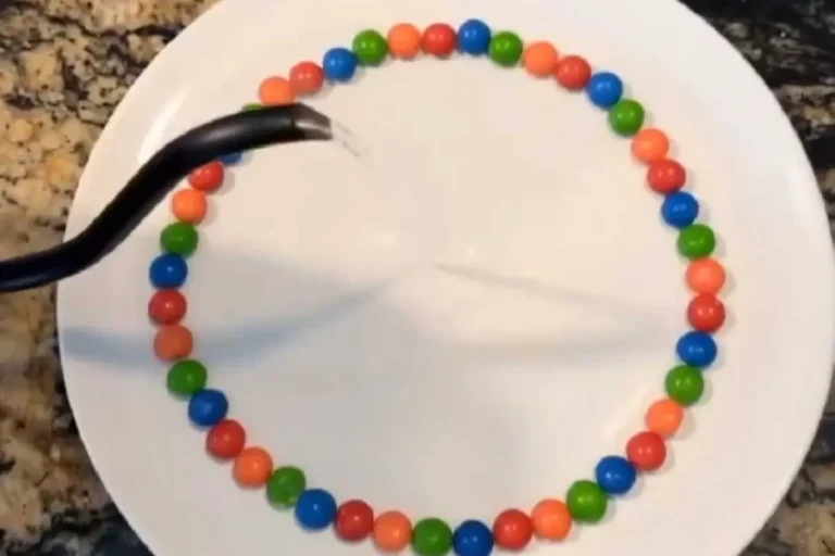 La cuenta de Instagram @geometriasagrada.es desarrolla: «En este fascinante experimento, se deja caer agua caliente en un círculo de coloridos M&M’s para formar un ‘arcoíris’. Observe con atención, ya que un patrón sorprendente se formará ante sus ojos. El azúcar presente en los colores dulces se liberará de sus cáscaras duras y se encontrará en el centro».