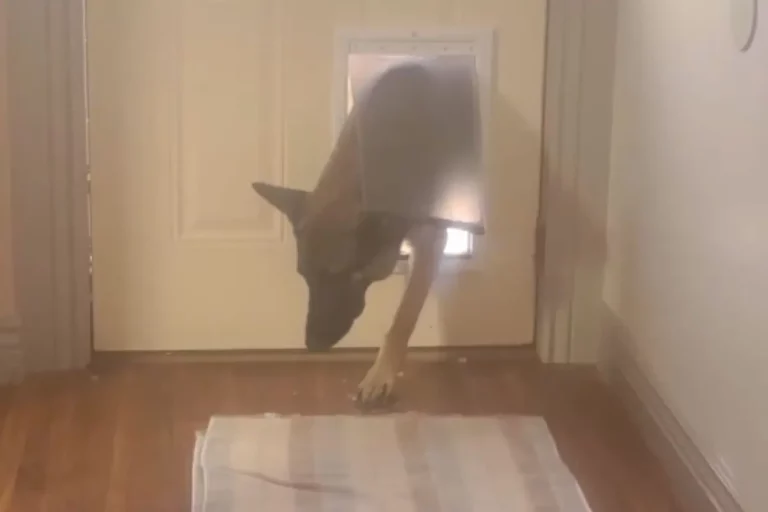 En las imágenes, se ve entrar por la puerta para mascotas a un pastor alemán, seguido tranquilamente por un pequeño venado y, finalmente, por el otro can.