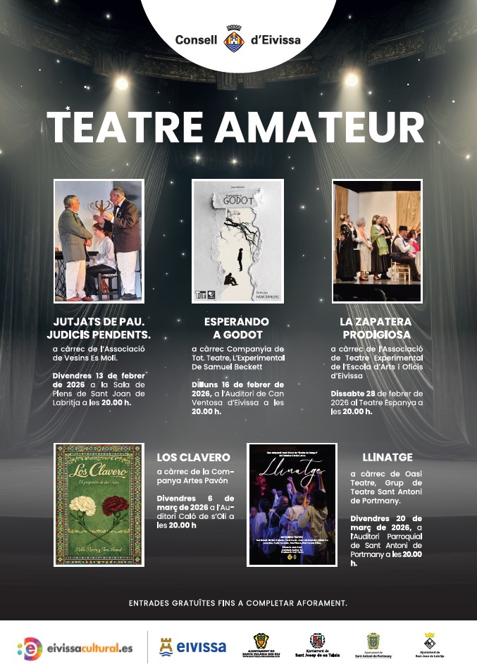 El Consell Insular d’Eivissa, a través del Departamento de Cultura, Educación y Patrimonio, pone en marcha la Temporada de Teatre Amateur, una iniciativa que tiene como principal objetivo apoyar y dar visibilidad a los grupos de teatro local. De este modo, se les ofrece no solo un espacio escénico, sino también una oportunidad real para dar a conocer sus creaciones artísticas al público de la isla.
