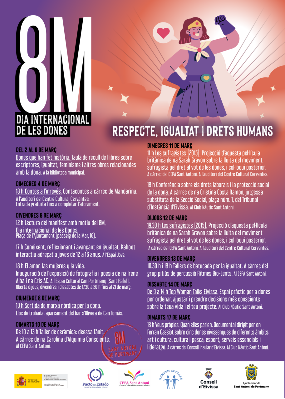 El Ayuntamiento de Sant Antoni de Portmany ha presentado el programa de actividades organizado por la concejalía de Igualdad con motivo del Día Internacional de la Mujer, que se celebra el próximo 8 de marzo. La agenda, que se desarrollará a lo largo de varias semanas, reúne propuestas culturales, educativas, deportivas y formativas dirigidas a toda la ciudadanía, con el objetivo de promover la igualdad y visibilizar el papel de la mujer en la sociedad.