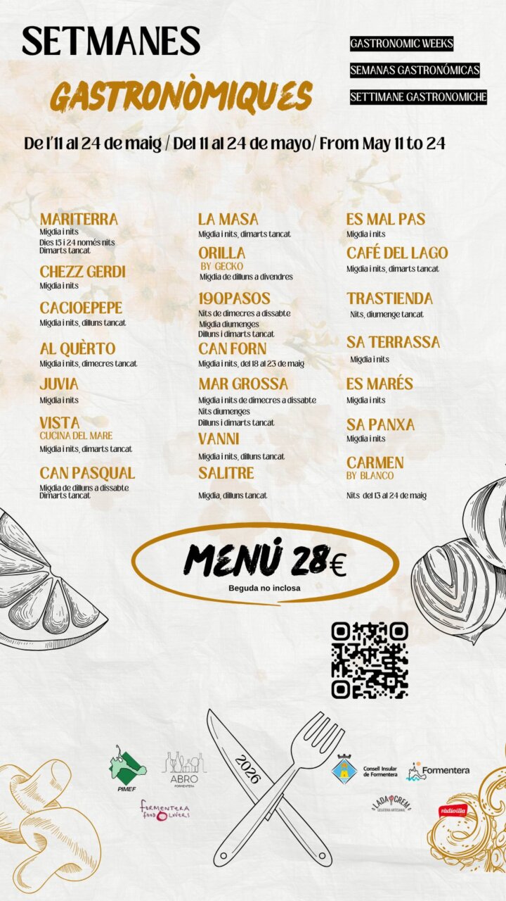 En esta edición participarán más de una veintena de establecimientos repartidos por toda la isla, entre ellos Mariterra, Chezz Gerdi, Cacio e Pepe, Al Quèrto, Mar Grossa, Vanni Formentera, Juvia, Vista cucina del mare, La Masa, Orilla by Gecko, 190 Pasos, Can Forn, Es Mal Pas, Café del Lago, Trastienda, Sa Terrassa, Es Marés, Salitre, Can Pasqual, Sa Panxa o Carmen by Blanco, entre otros.