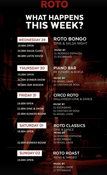 Desde las 19:00 horas, el restaurante se transforma en un auténtico circo del terror con un Boiler Room en directo hasta las 02:00. La consigna: disfraz obligatorio y actitud de show.