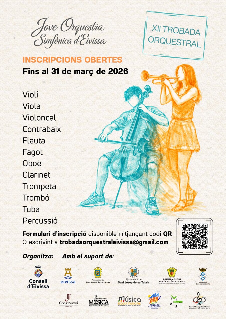 Las inscripciones pueden formalizarse mediante el formulario disponible a través del código QR habilitado en los carteles de la Trobada o enviando un correo electrónico a trobadaorquestraleivissa@gmail.com.