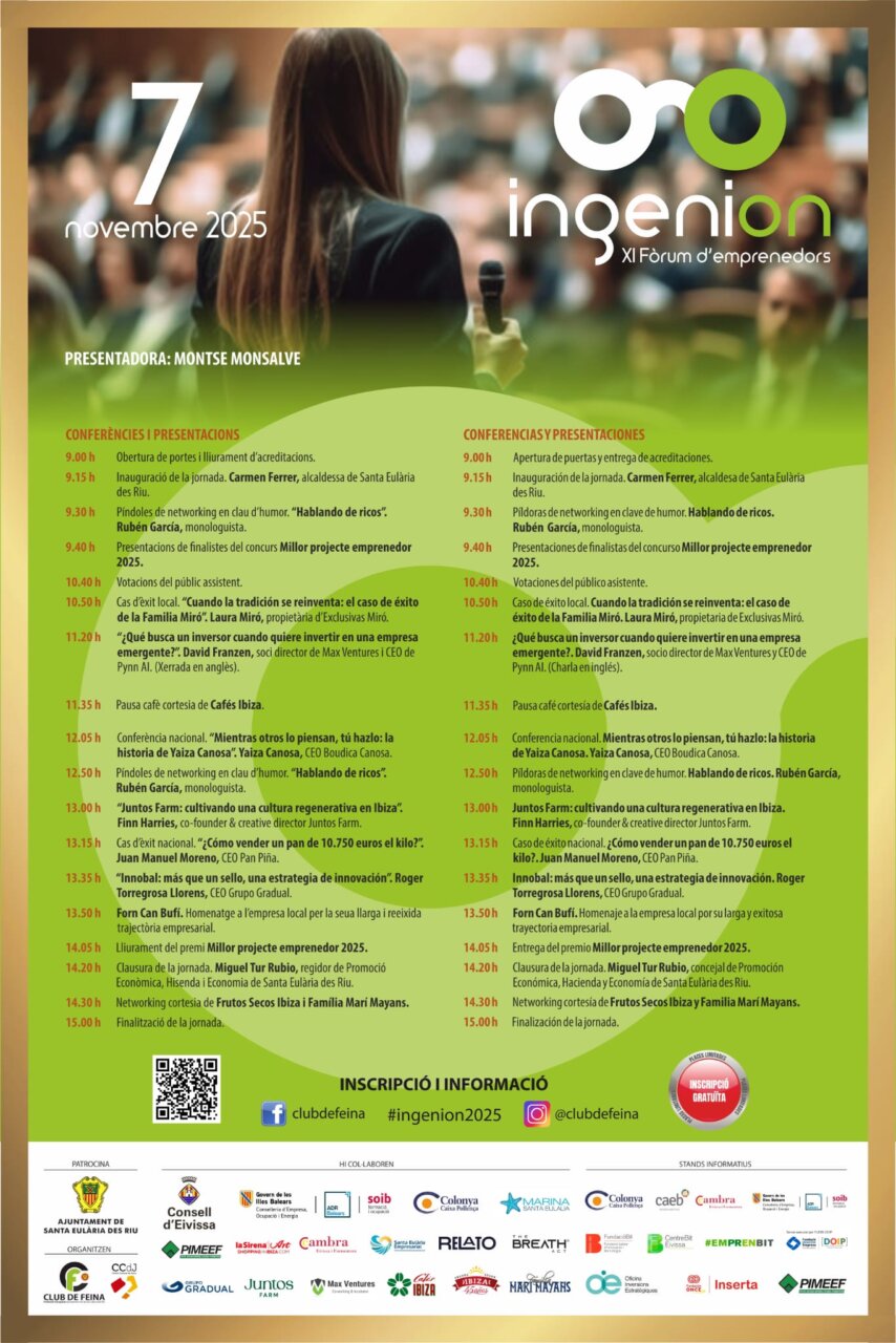 Ingenion 2025 contará con la colaboración del Consell Insular d’Eivissa, el Servei d’Ocupació de les Illes Balears (SOIB), ADR Balears, Caixa Colonya, Marina Santa Eulalia, Pimeef, Art – La Sirena, Cambra de Comerç d’Eivissa i Formentera, Santa Eulària Empresarial, Agencia Relato, The Breath Act, Gradual Ingenieros, Juntos Farm, Max Ventures, Cafés Ibiza, Frutos Secos Ibiza y Familia Marí Mayans.