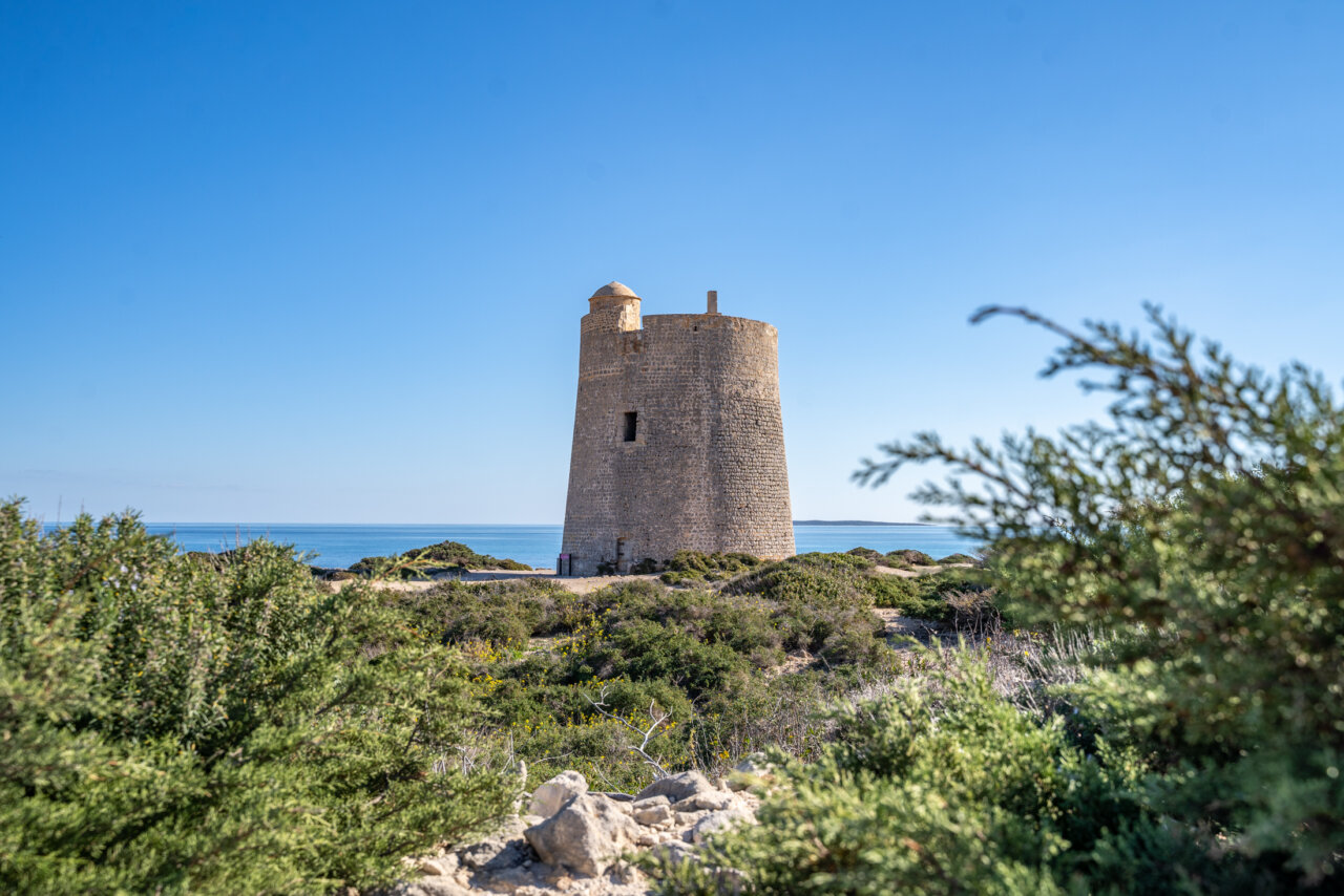 El camino conduce hasta la torre de Ses Portes, una construcción defensiva del siglo XVIII situada frente al canal que separa Ibiza y Formentera. Es un itinerario llano y amplio, apto también para bicicletas, que permite disfrutar del silencio del parque natural y de vistas despejadas en los días claros de invierno.