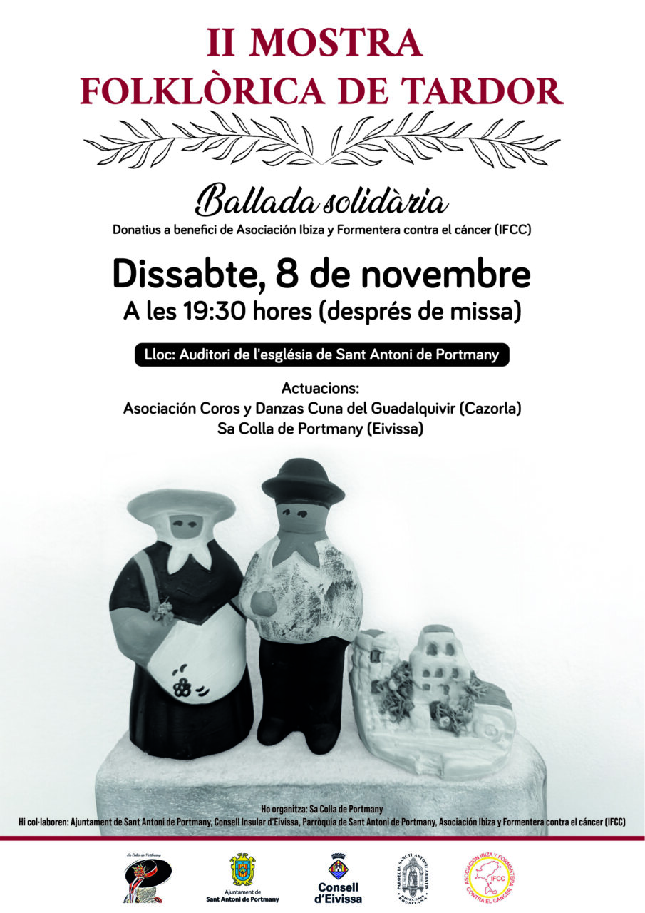 El auditorio de la iglesia de Sant Antoni de Portmany volverá a llenarse de música, color y tradición este sábado 8 de noviembre por la tarde con la celebración de la II Mostra Folklòrica de Tardor. El encuentro, organizado por Sa Colla de Portmany, reunirá bailes, trajes y sonidos que forman parte de la identidad de Ibiza, en un ambiente festivo y solidario que se consolida como una cita destacada del otoño portmanyí.