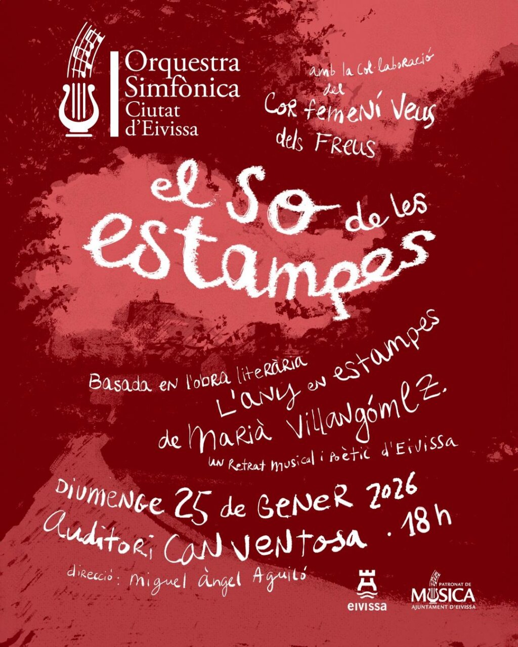La obra ‘El so de les estampes’ está basada en el libro ‘L’any en estampes’, de Marià Villangómez, y propone un recorrido musical por los doce meses del año a partir de sus textos. Se trata de una composición para orquesta sinfónica, coro femenino y narrador que dibuja un retrato sonoro y poético de Ibiza.