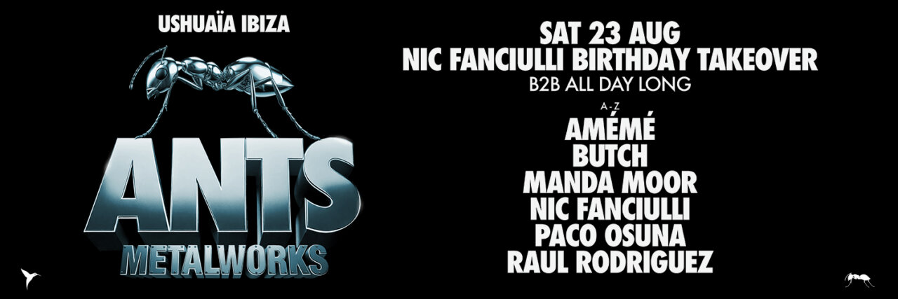 El próximo sábado 23 de agosto, Nic Fanciulli tomará el control total de ANTS METALWORKS para celebrar su cumpleaños en la pista al aire libre más icónica de la isla: Ushuaïa Ibiza. Un evento especial con un elenco B2B estelar que promete ser uno de los highlights del verano.