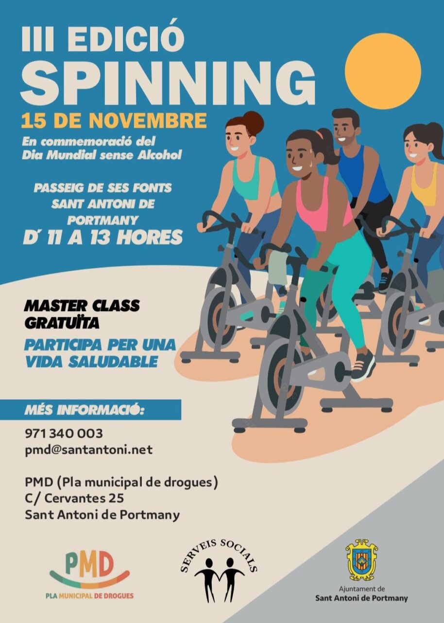 El Ayuntamiento de Sant Antoni de Portmany, a través de la Concejalía de Bienestar Social y el Plan Municipal de Drogas (PMD), organiza la tercera edición del taller de spinning con motivo del Día Mundial sin Alcohol. La actividad, abierta a toda la ciudadanía, tendrá lugar el sábado 15 de noviembre, de 11:00 a 13:00 horas, en el Passeig de ses Fonts.