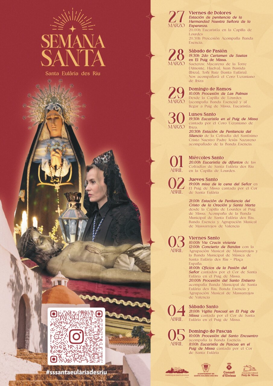 Ese mismo día, en Santa Eulària, habrá eucaristía en la Capilla de Lourdes a las 20.00 horas y, media hora después, a las 20.30 horas, se celebrará una procesión. El cartel de la Semana Santa de Santa Eulària destaca además la estación de penitencia de la Hermandad Nuestra Señora de la Esperanza a las 20.00 horas, con eucaristía en la Capilla de Lourdes y procesión acompañada por banda.