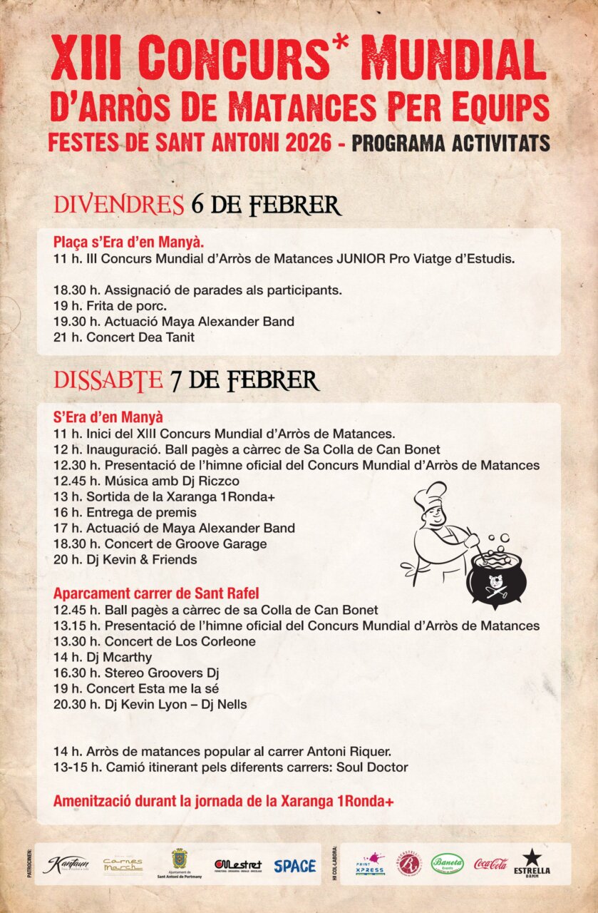 Ese mismo espacio acogerá, a partir de las 18.30 horas, el acto de asignación de puestos para los equipos participantes en el concurso del sábado. Durante la tarde se elaborará una frita de porc y el ambiente estará animado con las actuaciones musicales de Maya Alexander Band y Dea Tanit, en una jornada que servirá como previa perfecta al gran encuentro gastronómico del sábado en Sant Antoni.