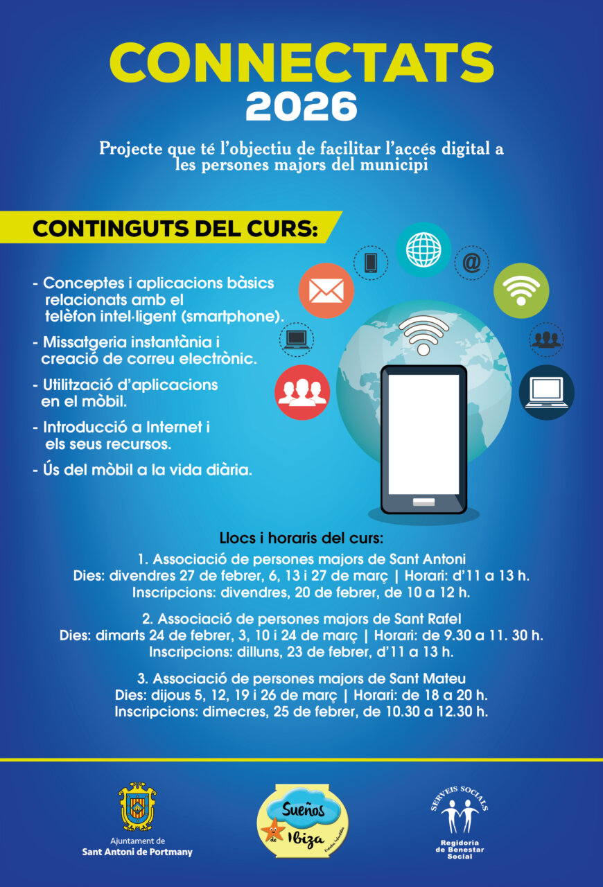 El Ayuntamiento de Sant Antoni de Portmany, a través de la concejalía de Bienestar Social, pone en marcha un año más el curso ‘Connectats’, una propuesta formativa pensada para mejorar las habilidades digitales de las personas mayores del municipio y facilitar su integración en la sociedad actual.
