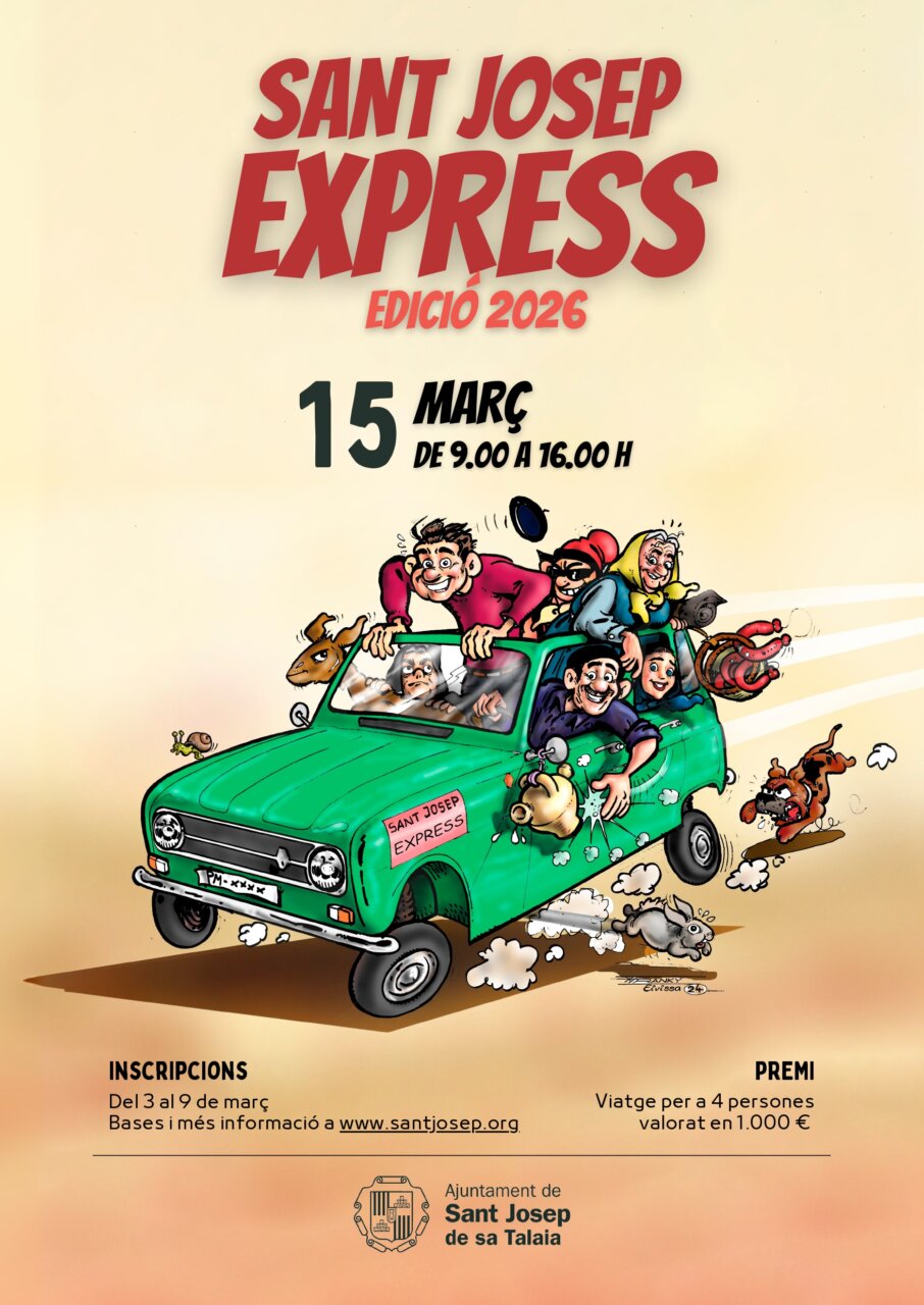 El Ayuntamiento de Sant Josep de sa Talaia ha abierto el plazo de inscripción para una nueva edición del Sant Josep EXPRESS, la gimcana intergeneracional que forma parte del programa de Fiestas de Sant Josep 2026. La actividad se celebrará el domingo 15 de marzo de 2026, de 9.00 a 16.00 horas, y propone un recorrido por distintos puntos del municipio a través de pruebas por equipos.