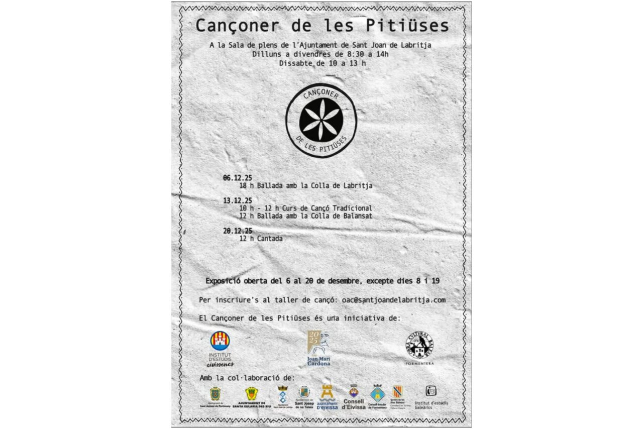 Sant Joan de LabritjaFecha: Sábado, 6 de diciembre Hora: 18:00 h Lugar: Sala de Plenos del Ayuntamiento de Sant Joan de Labritja Este sábado se inaugura la exposición del Cancionero de las Pitiusas con la participación del grupo de Labritja, un evento que pone en valor el patrimonio musical tradicional de Ibiza y Formentera. Durante la jornada se […]